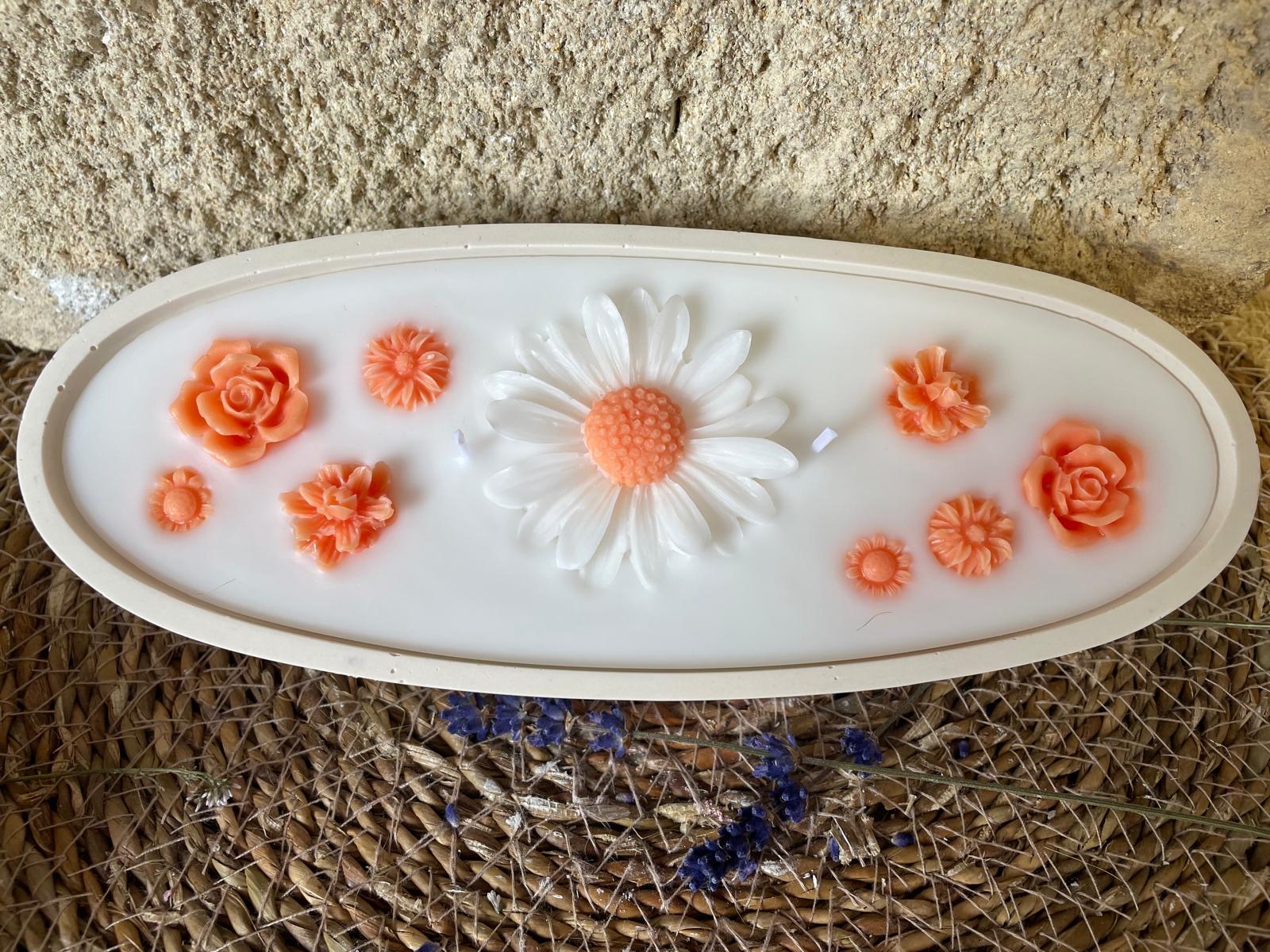 Cette bougie en forme de jardin de marguerite est faite en cire de soja végétale, faite à la main. Sa mèche est en coton. Son contenant en plâtre de Paris.